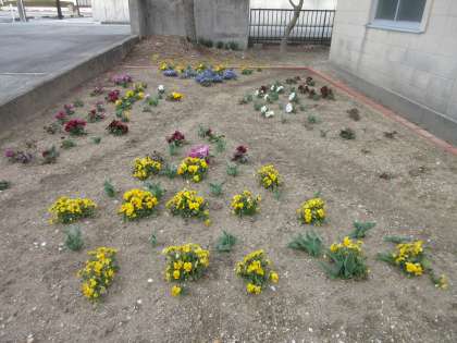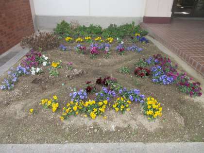 暖かくなってきたからでしょう、北中花壇のパンジーたちがもこもこです。