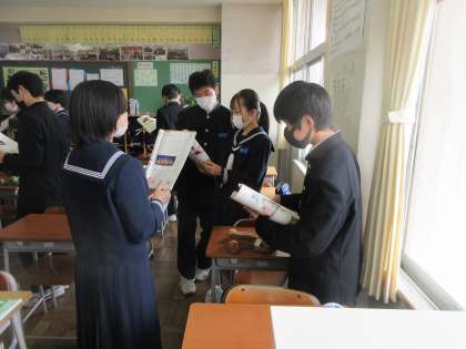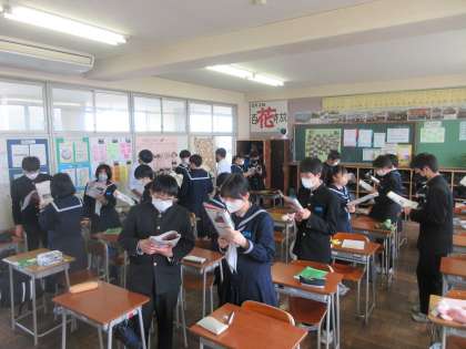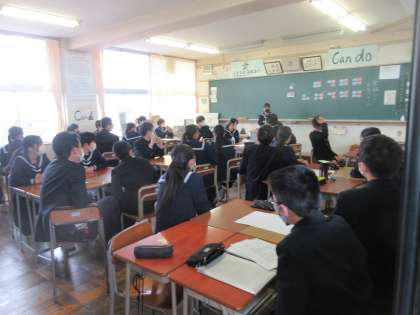 2−1学活、2−2英語の授業です。 学活では、学級レクリエーションを行い、英語はペアになって会話練習を行いました。
