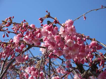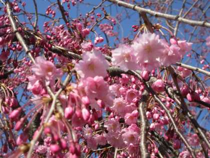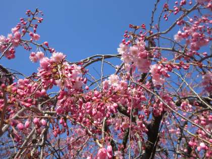 校門横のしだれ桜が、少しずつ花を咲かせています。