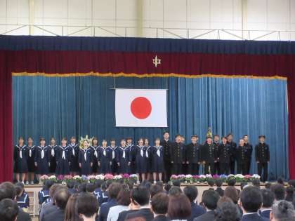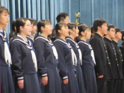 入学式(その7) 公開日 2023/04/07 更新日 2023/04/07 北中NEWS 校歌紹介です。 特別に編成された合唱隊が本校の校歌を披露しました。 とても素敵な合唱でした。1年生のみなさん、先輩のようにエネルギーあふれる合唱ができたらよいですね!!