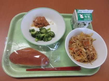 4/10(月)今日の給食 公開日 2023/04/10 更新日 2023/04/10 給食 令和5年度の給食が、今日からスタートしました。 「健全な心は、健全な体に宿る」と言われます。 モリモリ食べて、健康で丈夫な体をつくりましょう! <献立> 減量コッペパン 牛乳 照焼きチキン えごまドレッシングサラダ 焼きそば