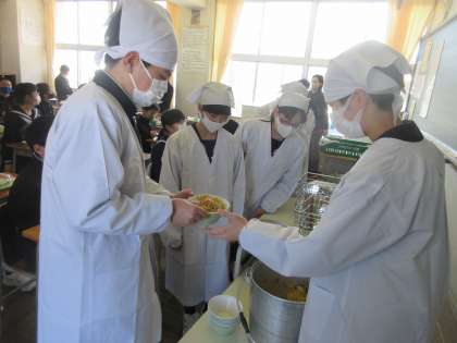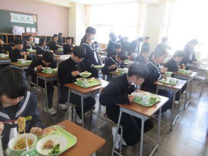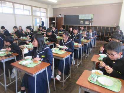 中学校生活初めての給食 公開日 2023/04/10 更新日 2023/04/11 給食 1年生は、中学校に入学して初めての給食でした。配膳等の当番活動は、思っていた以上に上手に行うことができ、食事の時間を十分にとることができました。