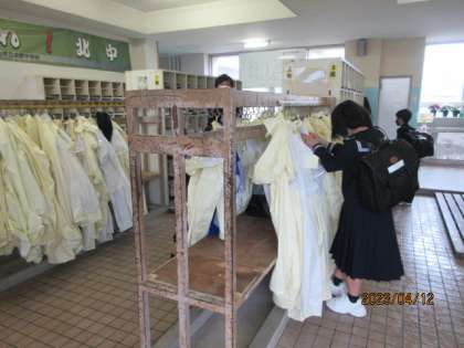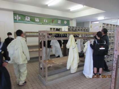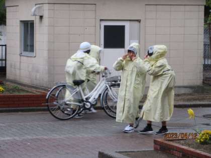 雨の日は、自転車通学生は合羽を着用します。 生徒玄関には、合羽がずらりときれいにつり下げられていました。