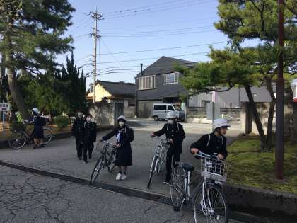 きらきらの太陽に見守られ、生徒は元気に登校しています。