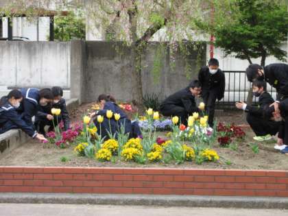 あいさつ運動とともに、花壇の除草にも多くの生徒が参加しています。