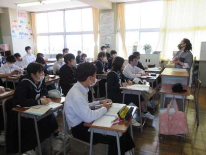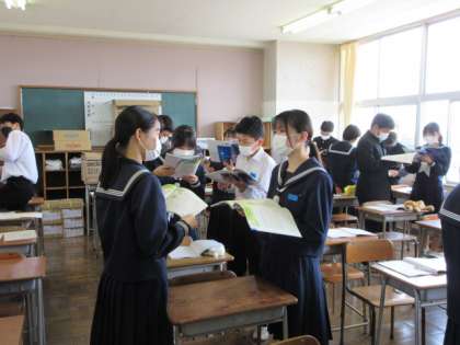 ペアでの音読練習の様子と先生の話を集中して聞いている様子です。