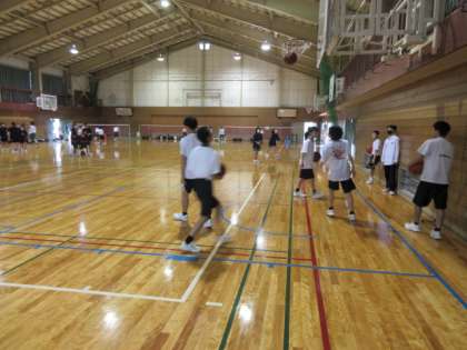 上の写真は、男子バスケットボール部の活動です。「レイアップ」という練習で、ゴール下からのシュート練習です。