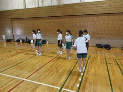下の写真は、女子バドミントン部の活動です。3,2年の先輩が1年生にフットワークを教えています。このステップで後ろに下がりシャトルを打ちます。
