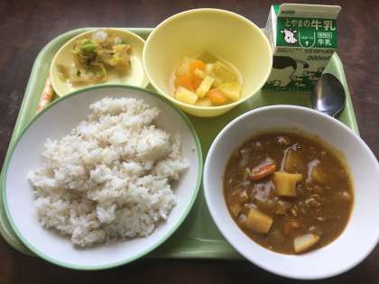 4/28(金)今日の給食 公開日 2023/04/28 更新日 2023/04/28 北中NEWS 今日のメインディッシュは、カレーライス!! 本年度初のカレーで、生徒はウキウキです!! <献立> 麦ごはん 牛乳 カレーライス 福神和え フルーツゼリーミックス 棒チーズ