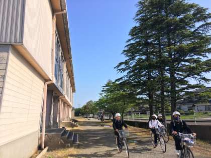 きらきらの太陽に見守られ、生徒は元気に登校しています。