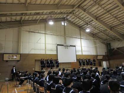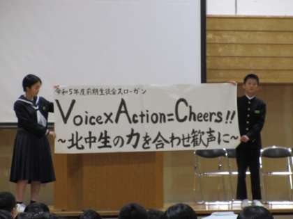 1・2限に、令和5年度前期生徒総会を行いました。 はじめに、執行部から、前期生徒会スローガンを発表しました。