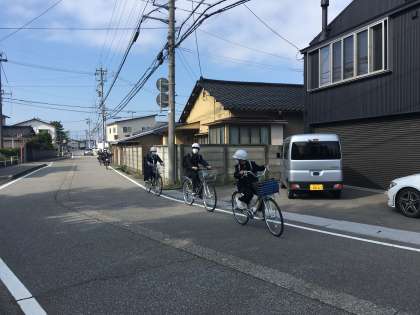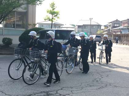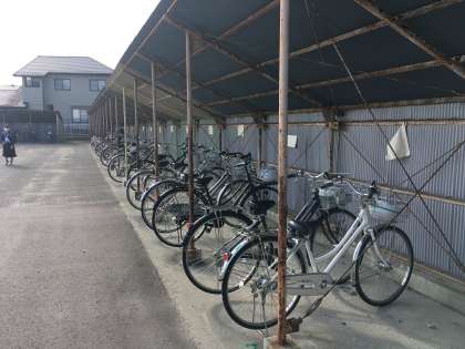自転車通学生は、学校内は自転車を押して自転車小屋に整頓して自転車を並べています。
