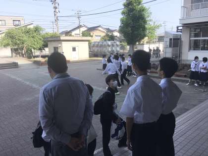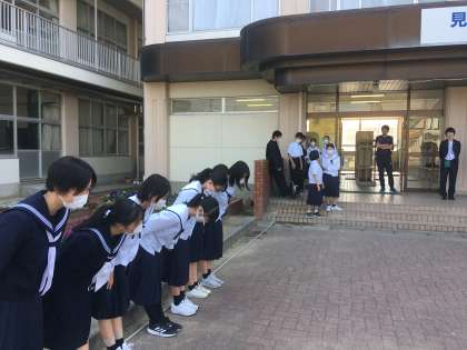 3年生は不在ですが、玄関前のあいさつ運動には、多くの生徒が参加しています!!