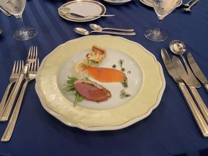 まずはオードブルです。 スモークサーモン、鴨のパストラミ、野菜のキッシュ です。