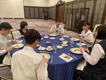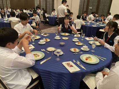 修学旅行 テーブルマナー 公開日 2023/05/17 更新日 2023/05/17 第3学年 魚料理が出てきました。 天然真鯛のポワレ・白ワイン風味のソース です。 白ワインが使われていますが、加熱してアルコールは飛ばしてあるので、中学生でも安心して食べることができます。