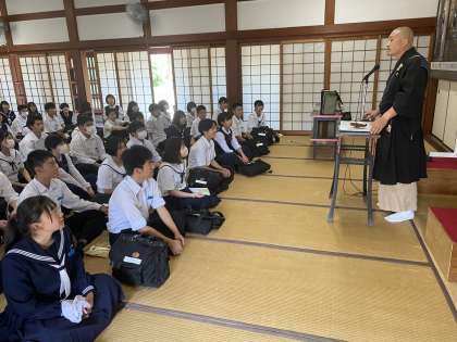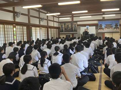 修学旅行 薬師寺 公開日 2023/05/18 更新日 2023/05/18 第3学年 法話、始まりました。 USJはジョーズ、YSJ(薬師寺)はボウズ でスタートしました。生徒は軽妙な語り口に、すでに吸い込まれています。