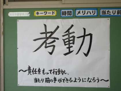 宿泊学習に向けて 公開日 2023/05/22 更新日 2023/05/22 第1学年 1学年の宿泊学習のスローガンです。 宿泊学習だけでなく、常に意識したいスローガンです。 「チーム1学年」、どんなときでも考えて行動できる学年を目指しましょう。