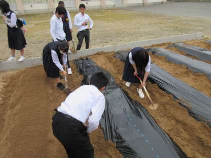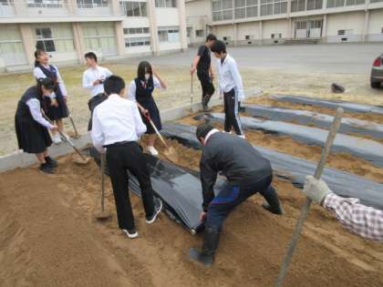 マルチが風で飛ばないように、土をかぶせました。