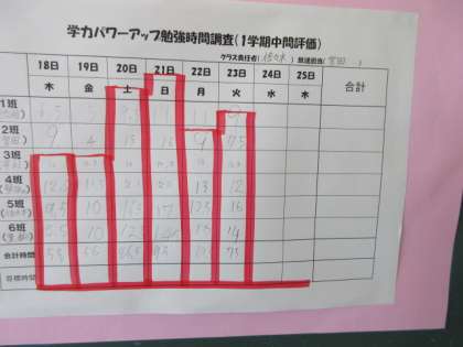 学年生徒会の取組(2学年) 公開日 2023/05/24 更新日 2023/05/24 第2学年 学力パワーアップとして、テスト週間の家庭での勉強時間を調べています。 時間もですが、中身の濃い、自分が納得できる家庭学習をしましょう。 今日も頑張っていますか?