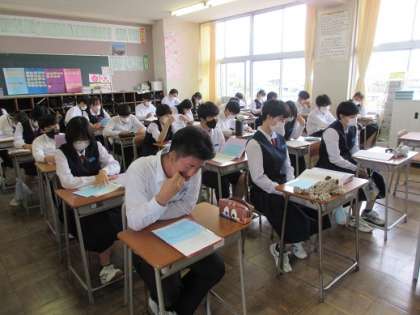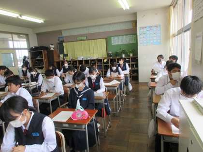 3年生 総合 公開日 2023/05/26 更新日 2023/05/26 第3学年 3年生は、6限の総合的な学習の時間にオープンハイスクールについて説明を受けました。 進路指導主事からオープンハイスクールの申し込みの流れや注意点について説明を聞いた後、教室で再度担任から説明を聞きました。 真剣な表情で話を聞いていました。 学校について調べたり見通しをもって計画を立てたりして、有意義な時間にしましょう。