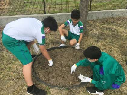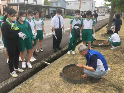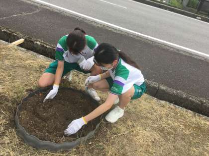 続いて、大広田のメインストリート沿いのフラワーポットに、キバナコスモスの種を蒔きます!!