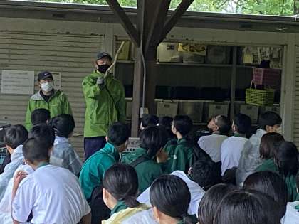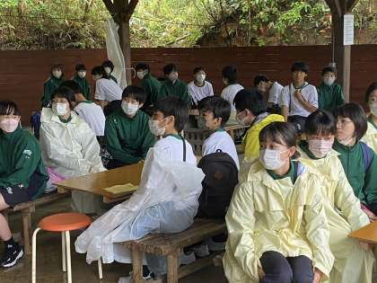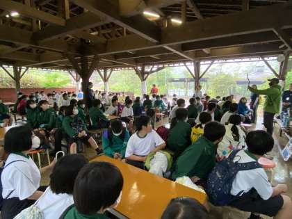 降雨が強いので、オリエンテーリングは行わず、マイスプーン・マイフォーク作りを行います。世界に一つだけのものを作るので、真剣に説明を聞いています。