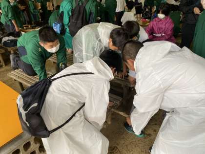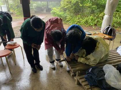 いよいよ作業が始まりました。 まずは、取手となる枝の裁断です。ノコギリを使って、4等分にしています。