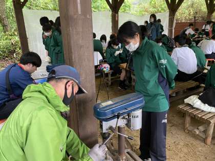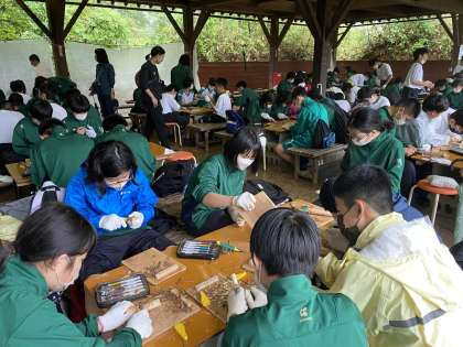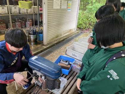 取手に穴をあけ、スプーン・フォークを差し込む準備をしています。高見先生が職人と化しています。