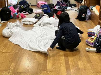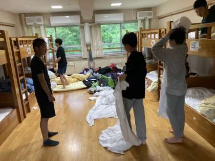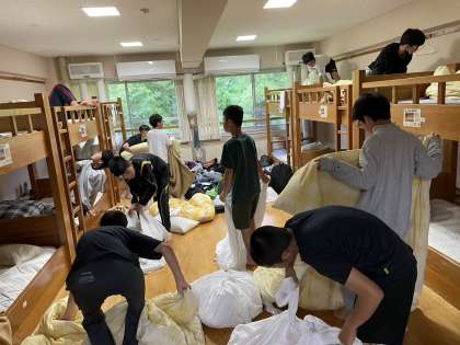 1年宿泊学習 起床 公開日 2023/05/30 更新日 2023/05/30 第1学年 おはようございます。国立能登青少年交流の家は、曇り空の朝を迎えました。この後天候が崩れることがないという予報になっているので、今日は屋外での活動ができそうです。 さて1年生は、6時起床をしっかり守り(?)、協力しながら寝具の片付けを行なっています。6:30〜清掃、7:00〜フレッシュタイム(朝の集い)と続きます。