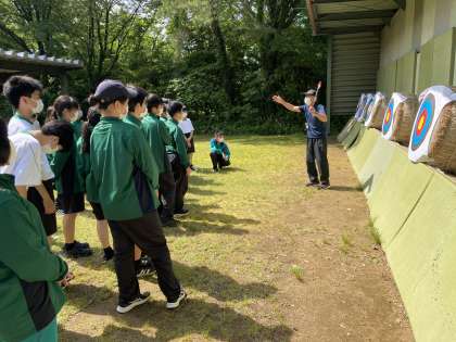 アーチェリー会場です。真剣に説明を聞いています。
