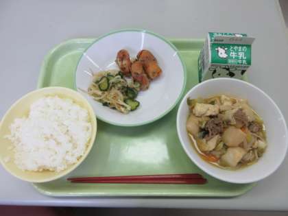 今日は、ちくわについてです。ちくわは、なんと、平安時代から食べられています。槍の先に白身魚のすり身を巻き付け、火で焼いて食べたのが始まりと言われています。焼き上がったちくわをはずしたときにできる槍のあとが、ちくわの穴です。外側は、ぱりぱりに焼けて、中はしっとりに仕上がる、ちくわ。平安時代の料理人の知恵ってすごいですね。