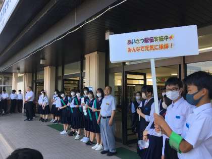 玄関前では、今日も元気な声が響きます!!