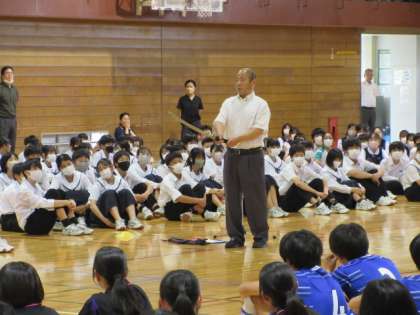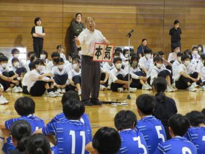 「中途半端な気持ちで刀を抜くことはできない。刀を振るということは、最大の防御である『構え』を崩して、『命をかけて』行うことになるからだ。明後日からの試合には命はかからないので、『真剣』=『本気』と言い換えることができる。北中生が各会場で『本気』になって、真剣勝負をしてくることを期待する」と、校長が選手に激励しました。