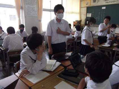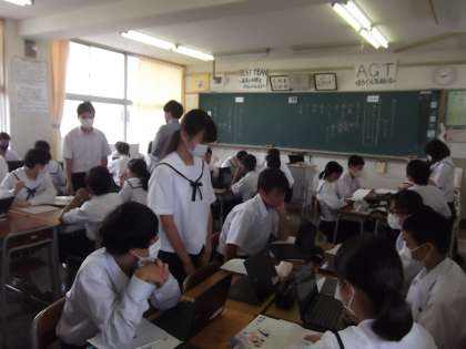 6/15(木)互見授業 公開日 2023/06/15 更新日 2023/06/15 第1学年 1−2で国語の互見授業が行われました。本校教員の研修の場になります。 自分の好きなことをスピーチで紹介するという課題に対し、まずクロムブックを活用し、スピーチの内容・技能を向上させようとしていました。その後、班内で発表し合い、成果について振り返っていました。身振り・手振りが入るなど、スタートに比べ上達しているようでした。