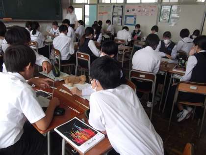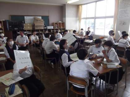 6/22(木)授業の様子 3年生 公開日 2023/06/22 更新日 2023/06/22 第3学年 3年生の授業の様子です。 理科では、割り箸を使って遺伝のしくみについて班内で学び合っていました。 英語では、ALTからの穴埋め問題に、班員同士話し合って回答していました。 そのクラスも、積極的・意欲的な雰囲気でした。