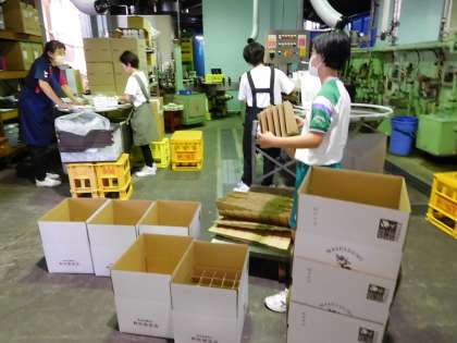 枡田酒造店:酒瓶を入れる段ボールを組み立てています。