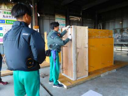 吉塚工務店:木材で大きな箱をつくっています。一からつくらせてもらってます。コンクリートをうつための道具の準備もしました。