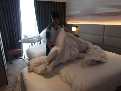 ダブルツリーbyヒルトン富山:ベッドメイキングをしています。とても丁寧にかつ短時間でできたと、担当の方から褒めていただきました。