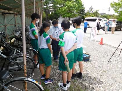 株式会社アイペック:北部中学校の外壁調査をするための機器の説明を受けています。