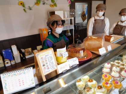 cake&caffeぽっくる:店頭でケーキの箱詰めをしています。今日は、ケーキに使うフルーツを切りました。