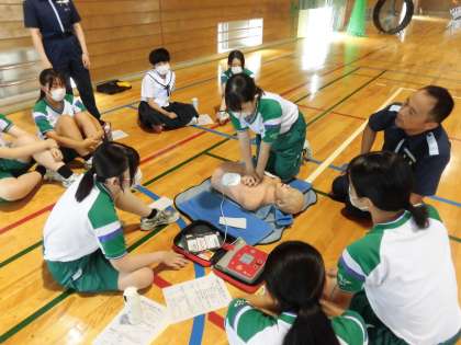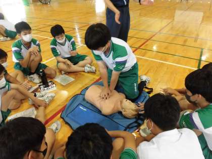 写真は、1、2組の心肺蘇生法講習の様子です。