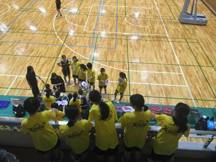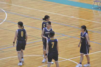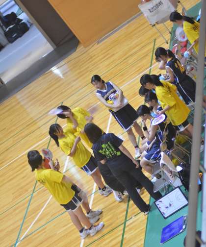 女子バスケットボール部 2回戦。休憩時間には、先輩のために、2階席から風を送ります。