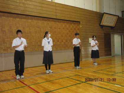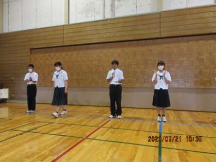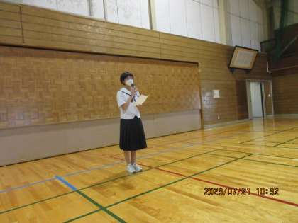 7/21(金)1年学年集会 体育大会の学年代表紹介 公開日 2023/07/21 更新日 2023/07/21 北中NEWS 事前に行ったアンケートにより、体育大会の学年代表が決定しました。今日は、代表となった生徒が体育大会への意気込みを、学年全体の前で堂々と述べました。 また、学年代表が「全員でBEST TEAMを目指し、いい集団になろう」と、締めくくりの挨拶をしました。