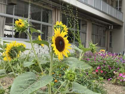 花壇ではヒマワリがすくすくと育っており、他の花々もきれいに咲き誇っています。