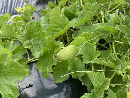 北中ファームでは、マクワウリがいくつか実をつけています。サツマイモも元気にツルをのばしていますので、ツル返しをして、実が大きくなるよう見守っています。