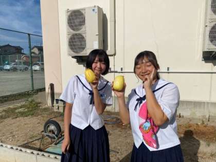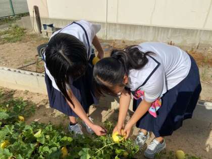 北中ファームの水やりを自主的に行っている2人から、「マクワウリがだいぶ大きく育っている」との報告がありました。においをかいだところ、甘いにおいを放っているものもあり、今日はそれを収穫しました。