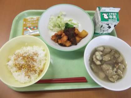 8/30(水)今日の給食 公開日 2023/08/30 更新日 2023/08/30 給食 今日の食材の「なす」は、8月に最も収穫量が多くなるので夏野菜の一つに挙げられますが、秋なすもおいしいです。原産地はインドで、日本には中国を介して7〜8世紀頃に伝わったようです。卵によく似た形をしているためか、英語では「エッグプラント」と呼びます。 <今日の献立> ごはん 牛乳 鶏肉とレバーのケチャップからめ そえ野菜 なすのみそ汁 野菜ふりかけ