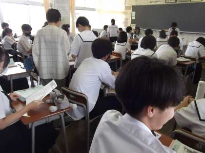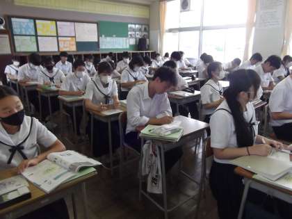 9/8(金)2年生の授業の様子 公開日 2023/09/08 更新日 2023/09/08 第2学年 2年生は、英語、理科、国語の授業に臨んでいます。 英語では、英語で出題されたテーマについて、教科書から答えを探っていました。