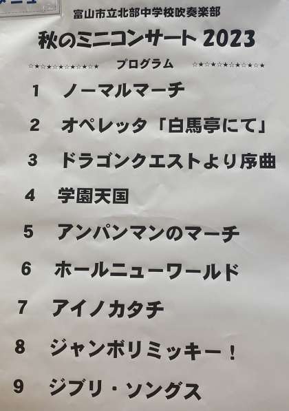 9/17(日)秋のミニコンサート2023 公開日 2023/09/17 更新日 2023/09/17 北中NEWS 本日10:00〜、吹奏楽部による「秋のミニコンサート2023」が本校体育館にて開催されます。3年生にとってラストコンサートになります。お時間のある方は、ぜひご来校ください。