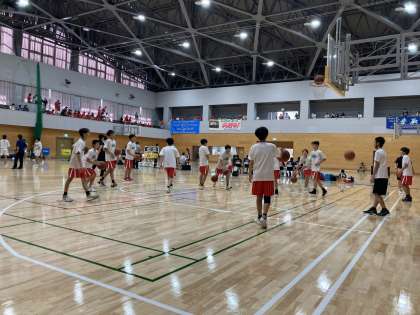男子バスケットボール部、ハーフタイムのアップの様子です。